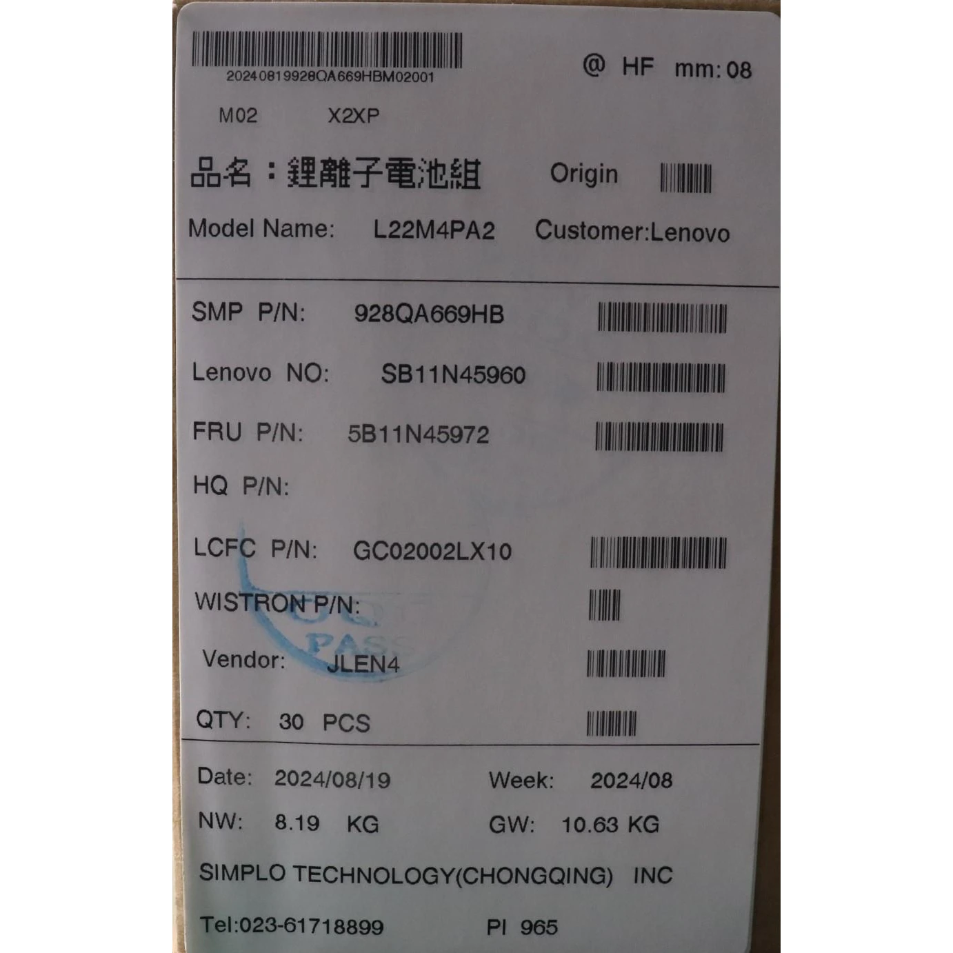 Especificaciones Batería Original Lenovo L22M4PA2 73.6Wh 4743mAh.